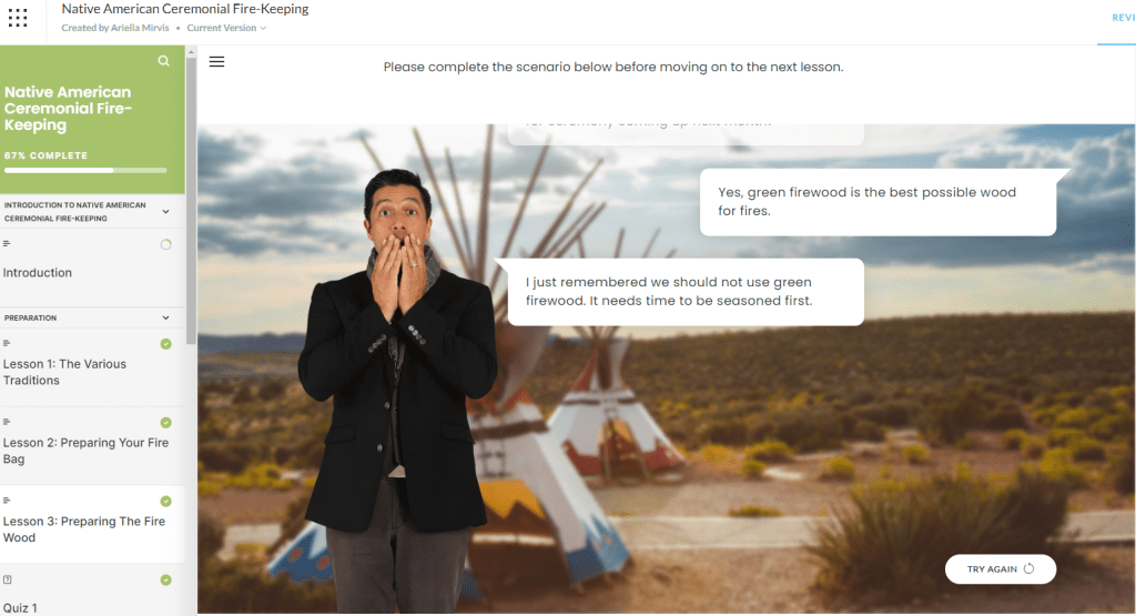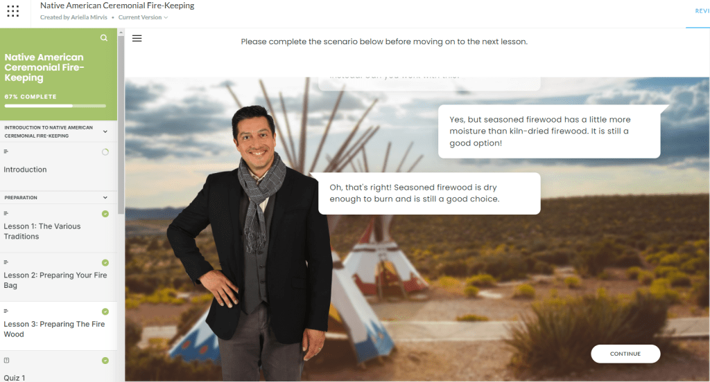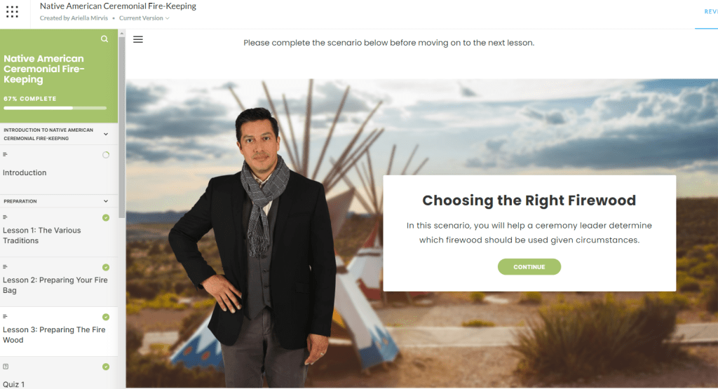 Developed a comprehensive e-learning course using Articulate Rise to educate volunteers on both practical and traditional aspects of fire-keeping for Sacred Fires ceremonies. The course includes lessons on three types of Native American traditions in ceremonies, ensuring volunteers can independently follow and respect these customs.
