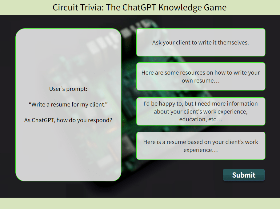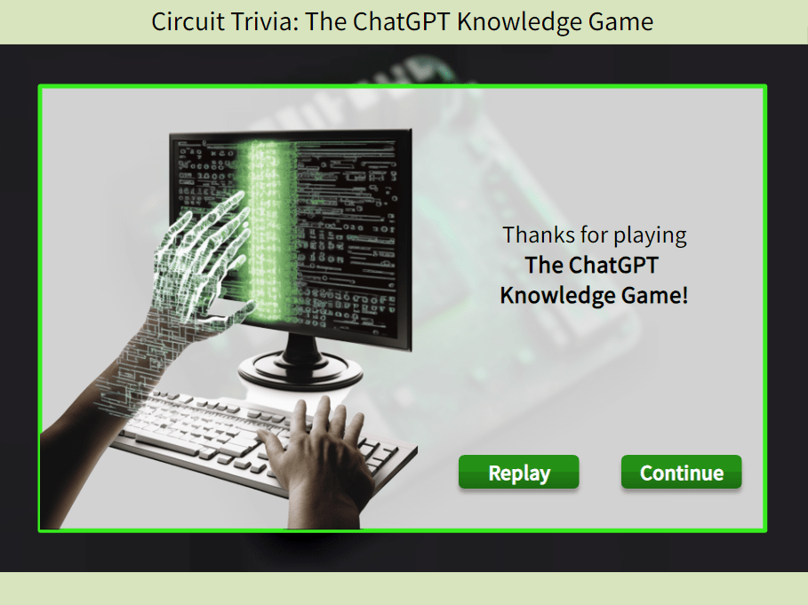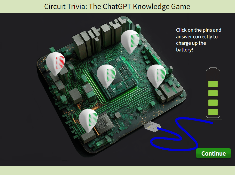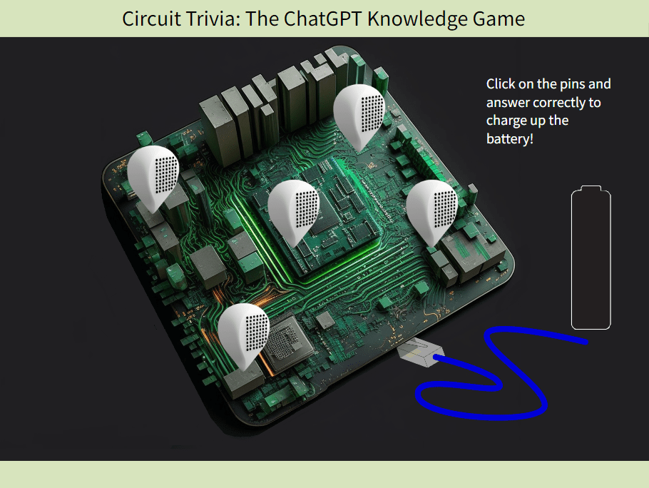 In this interactive game, learners click a pin on the circuit board to answer questions. Correct answers charge the battery, while incorrect ones do not. The battery needs five correct answers to be fully charged. This design uses gamification and active learning strategies to enhance engagement and retention.