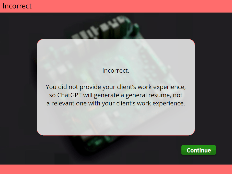 The challenge was to create a user-friendly, engaging e-learning course for employees with limited tech experience, ensuring they could effectively use AI for tasks like case notes, resumes & cover letters, and mock interviews, and retain information on technology typically beyond their expertise.